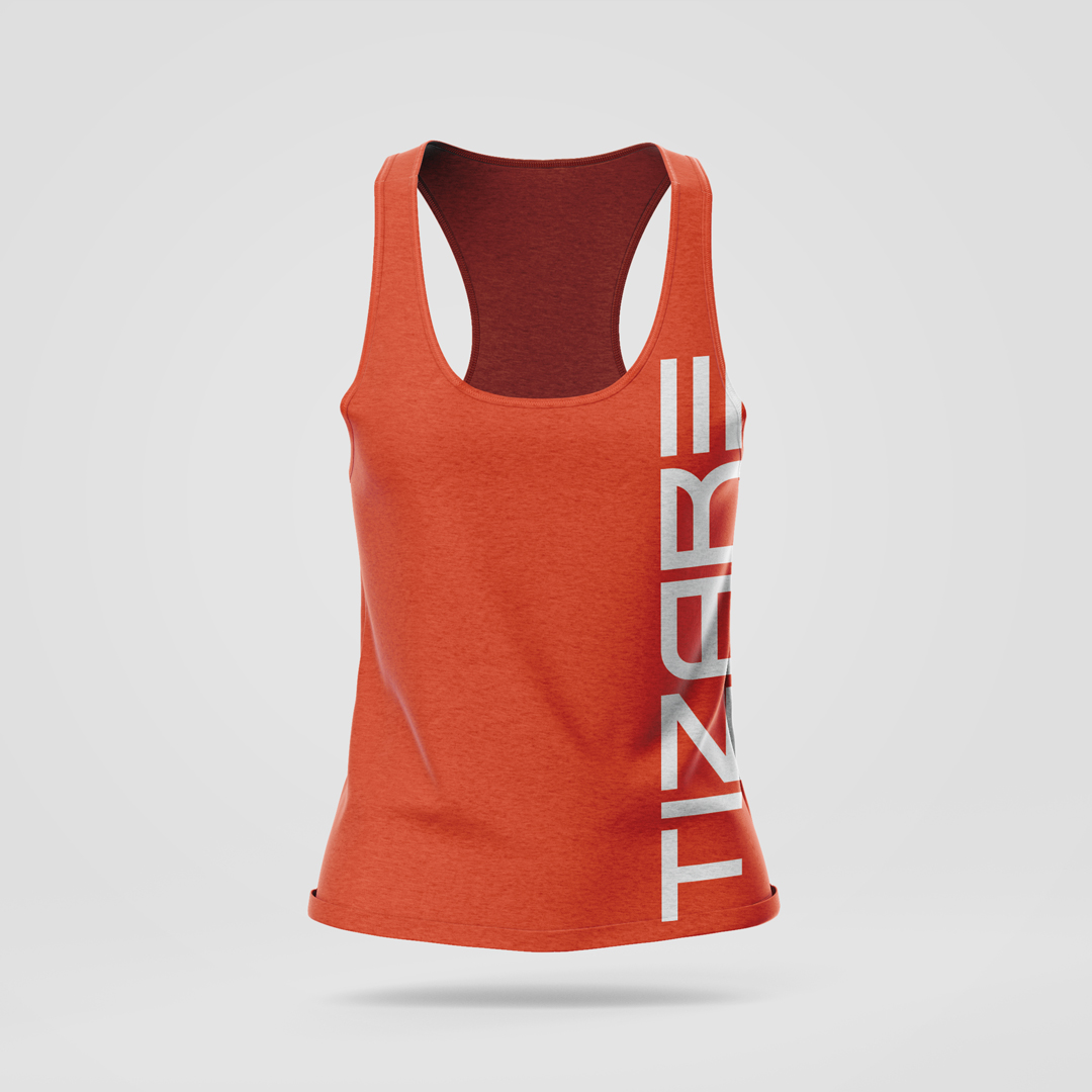 Camiseta de tirantes unisex oficial de Tizare. Permite lavado en lavadora, es transpirable. Disponible en desde la talla S a L, en colores gris, blanco y naranja.